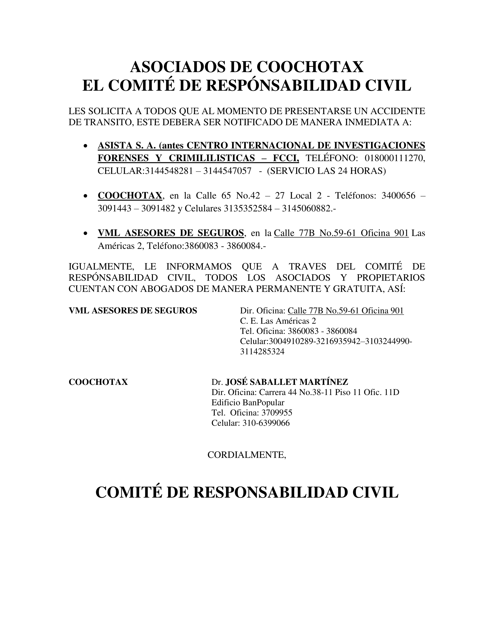 EL COMITÉ DE RESPÓNSABILIDAD CIVIL LES SOLICITA A TODOS QUE AL MOMENTO DE PRESENTARSE UN ACCIDENTE DE TRANSITO, ESTE DEBERA SER NOTIFICADO DE MANERA INMEDIATA A: